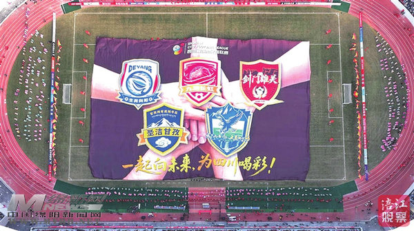 11月23日,綿陽九洲長虹隊主場對陣阿壩雪山雄鷹隊。圖為川北5支球隊的巨型Tifo(看臺拼圖)在體育場中間展開。 視覺綿陽資料圖片