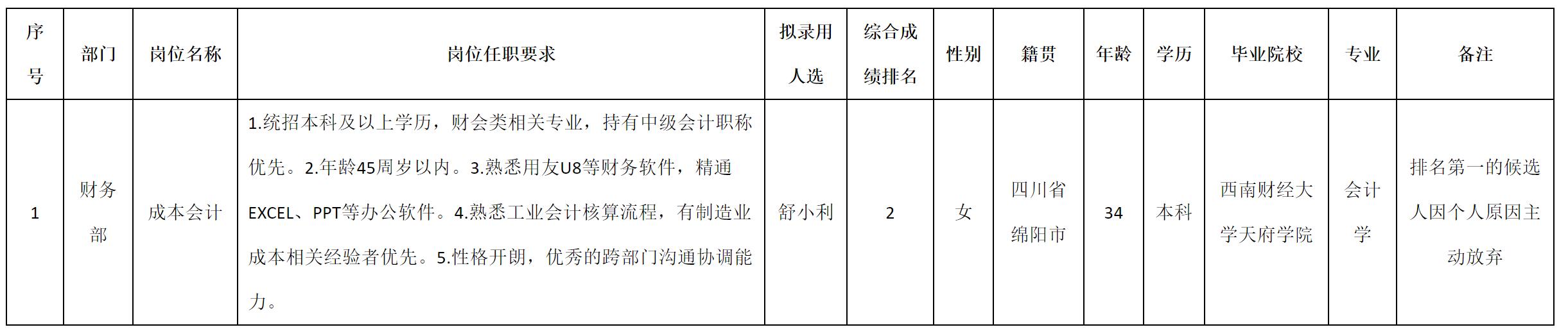 根據(jù)四川安和精密電子電器股份有限公司發(fā)布的招聘公告及招聘相關(guān)規(guī)定,經(jīng)測(cè)試、考察、體檢等程序,擬錄用舒小利同志到四川安和精密電子電器股份有限公司工作,現(xiàn)予以公示,具體情況如下: