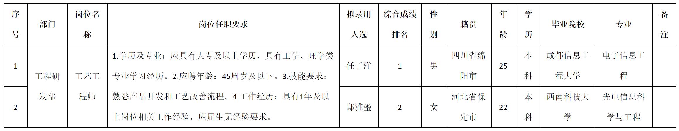 根據(jù)四川九華光子通信技術(shù)有限公司發(fā)布的招聘公告及招聘相關(guān)規(guī)定,經(jīng)測(cè)試、考察、體檢等程序,擬錄用任子洋等2名同志到四川九華光子通信技術(shù)有限公司工作,現(xiàn)予以公示,具體情況如下: