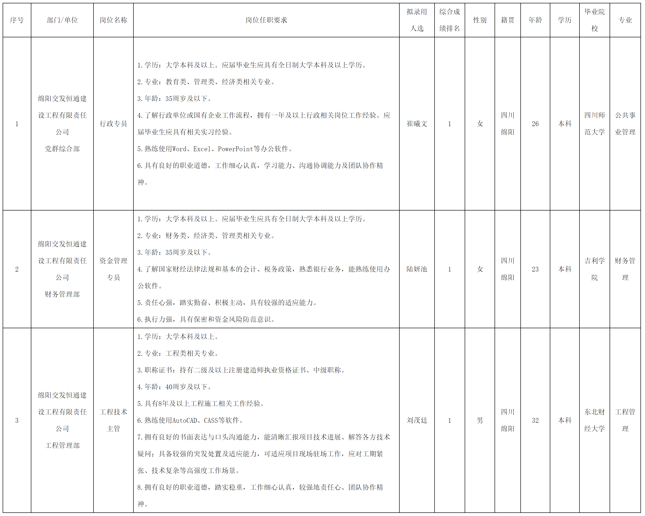 根據(jù)我司發(fā)布的招聘公告及招聘相關(guān)規(guī)定,經(jīng)初試、復(fù)試、體檢、背景調(diào)查等程序,擬錄用崔曦文等3名同志到綿陽交發(fā)恒通建設(shè)工程有限責(zé)任公司工作,現(xiàn)予以公示,具體情況如下: