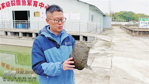 甲魚養(yǎng)殖基地負責人陳彬展示甲魚新品種“圌山1號”。 記者 陳元松 攝