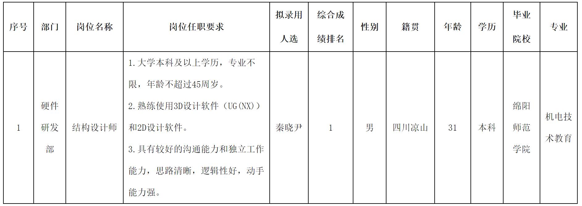 根據(jù)四川長(zhǎng)虹新網(wǎng)科技有限責(zé)任公司發(fā)布的招聘公告及招聘相關(guān)規(guī)定,經(jīng)面試、考察、體檢等程序,擬錄用秦曉尹同志到公司工作,現(xiàn)予以公示,具體情況如下: