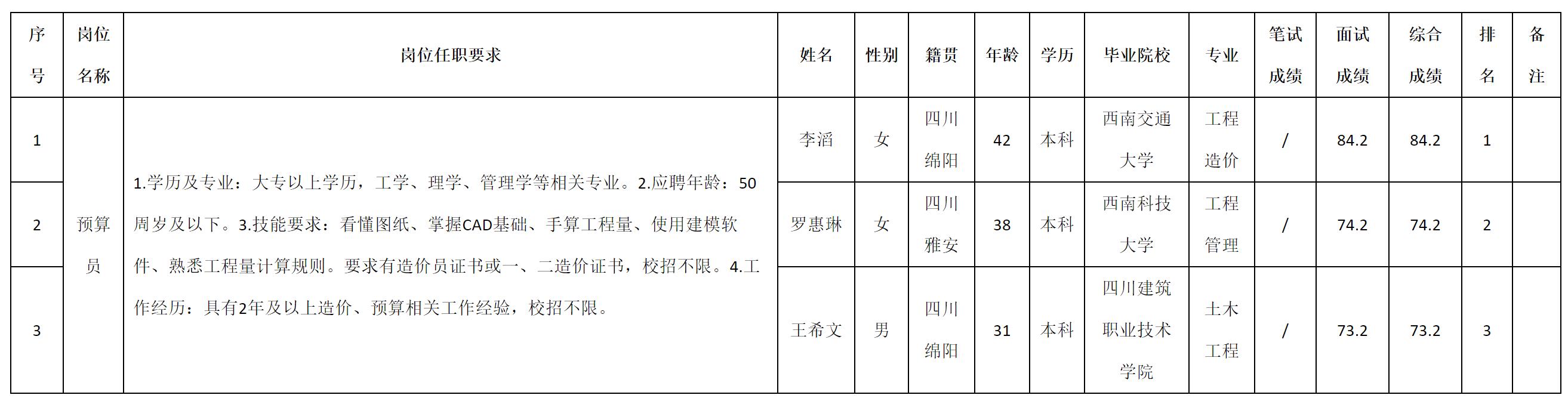 根據(jù)四川九洲建筑工程有限責(zé)任公司發(fā)布的招聘公告及招聘相關(guān)規(guī)定,現(xiàn)將測試成績予以公示。