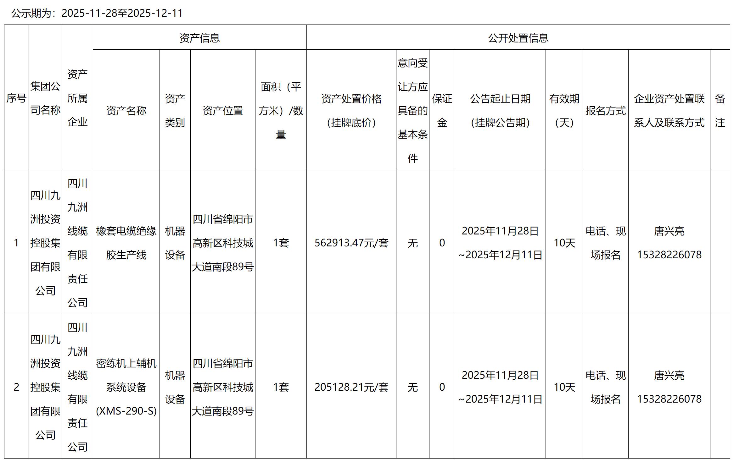 四川九洲線纜有限責(zé)任公司橡膠生產(chǎn)設(shè)備資產(chǎn)處置公告
