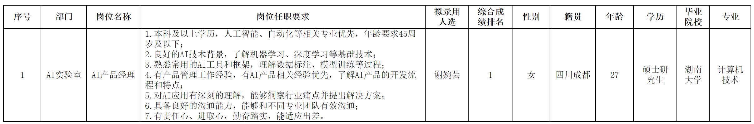 根據(jù)四川長虹虹微科技有限公司發(fā)布的招聘公告及招聘相關(guān)規(guī)定,經(jīng)面試、考察等程序,擬錄用謝婉蕓同志到四川長虹虹微科技有限公司工作,現(xiàn)予以公示,具體情況如下: