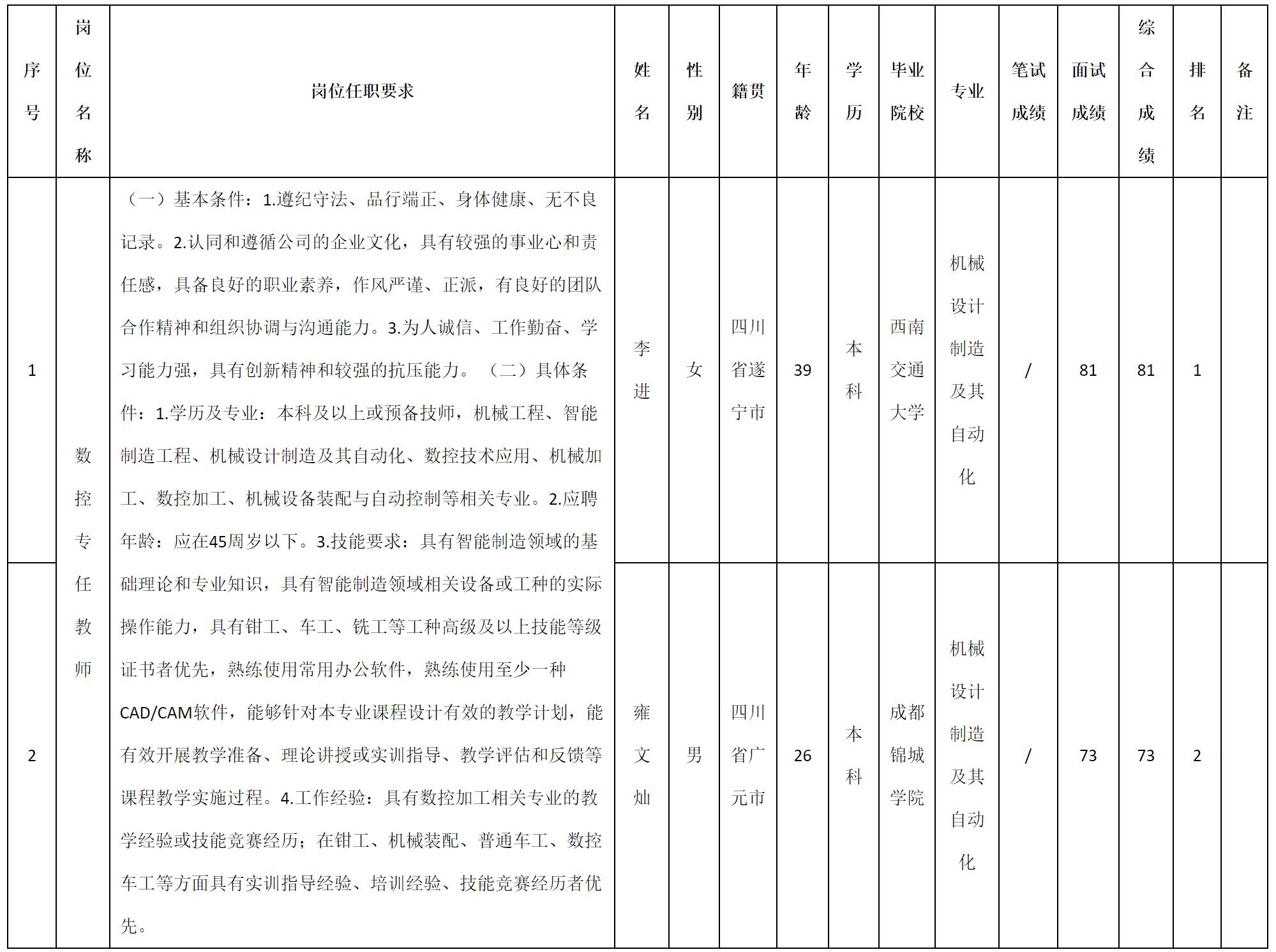 根據(jù)四川九洲教育投資管理有限公司發(fā)布的招聘公告及招聘相關(guān)規(guī)定,現(xiàn)將測(cè)試成績(jī)予以公示。