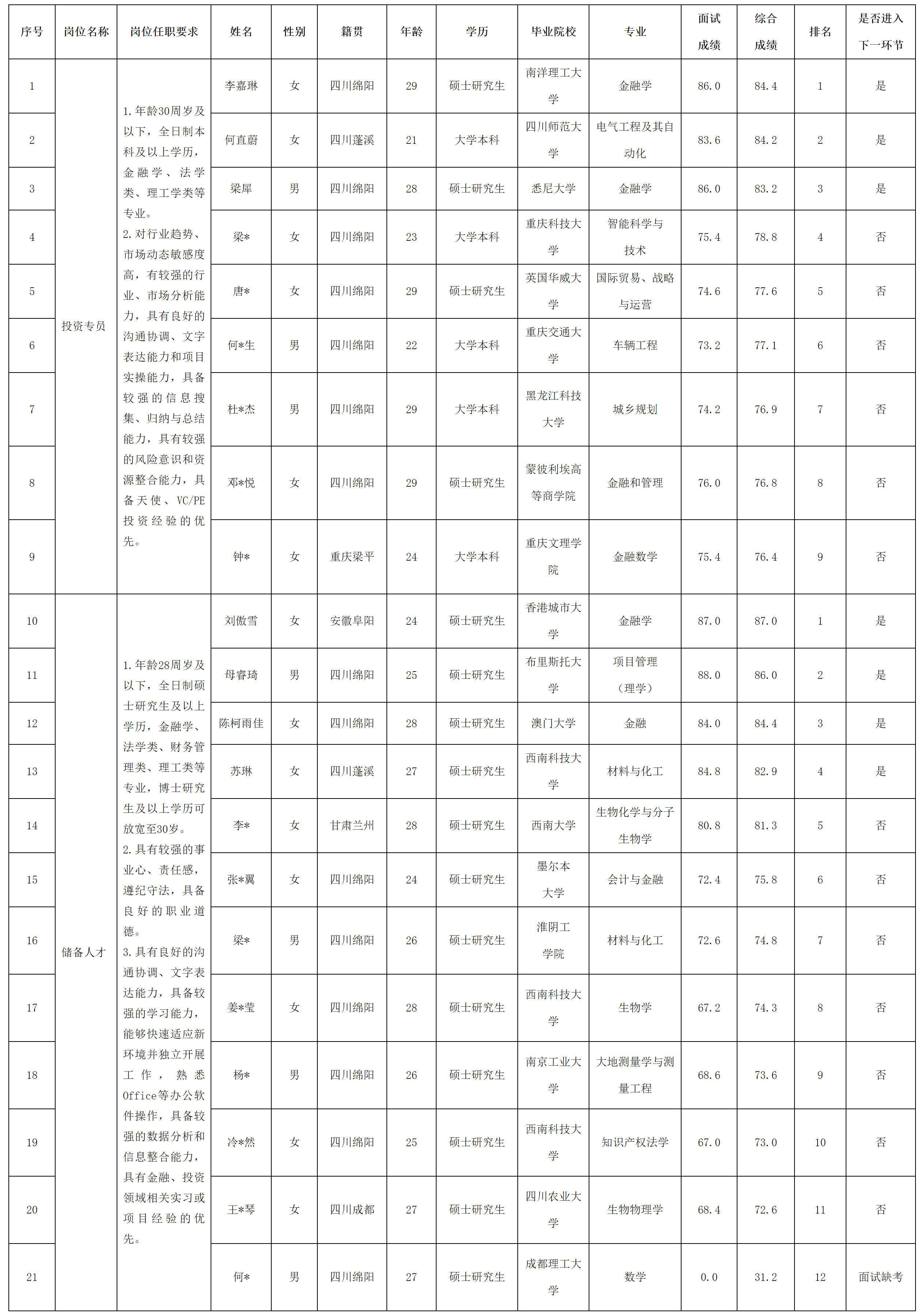 根據(jù)綿陽科技城科技創(chuàng)新投資有限公司發(fā)布的面向社會公開招聘投資專員等崗位的公告和招聘相關(guān)規(guī)定,經(jīng)筆試、面試等程序,現(xiàn)將綜合成績予以公示。