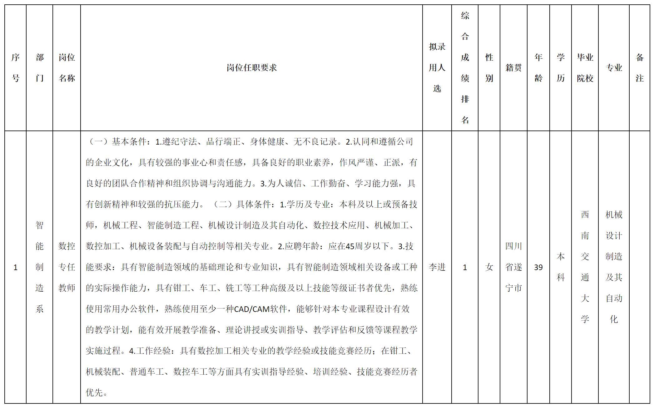 根據(jù)四川九洲教育投資管理有限公司發(fā)布的招聘公告及招聘相關(guān)規(guī)定,經(jīng)測試、考察、體檢等程序,擬錄用李進(jìn)同志到四川九洲教育投資管理有限公司工作,現(xiàn)予以公示,具體情況如下: