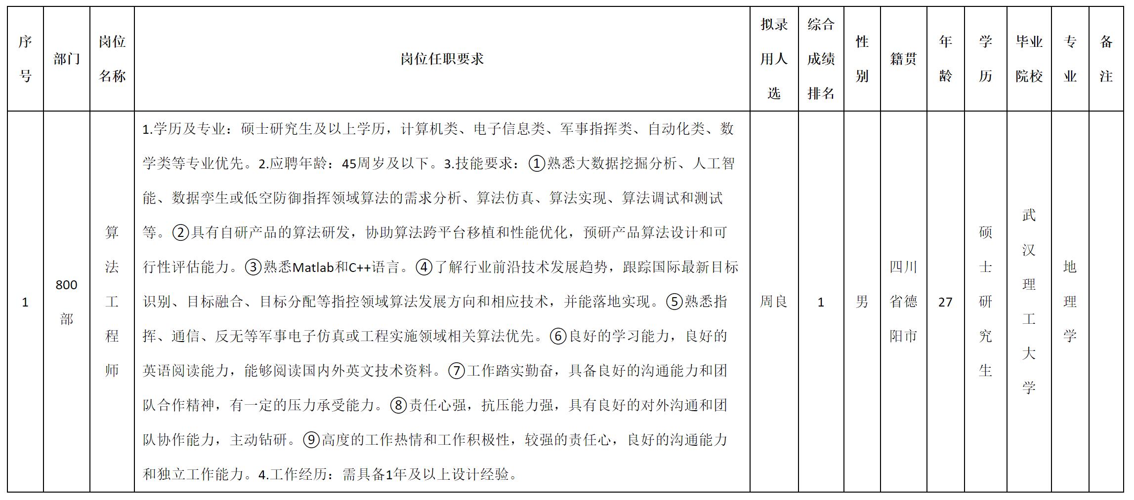 根據(jù)四川九洲電器集團有限責任公司發(fā)布的招聘公告及招聘相關(guān)規(guī)定,經(jīng)測試、考察、體檢等程序,擬錄用周良同志到四川九洲電器集團有限責任公司工作,現(xiàn)予以公示,具體情況如下: