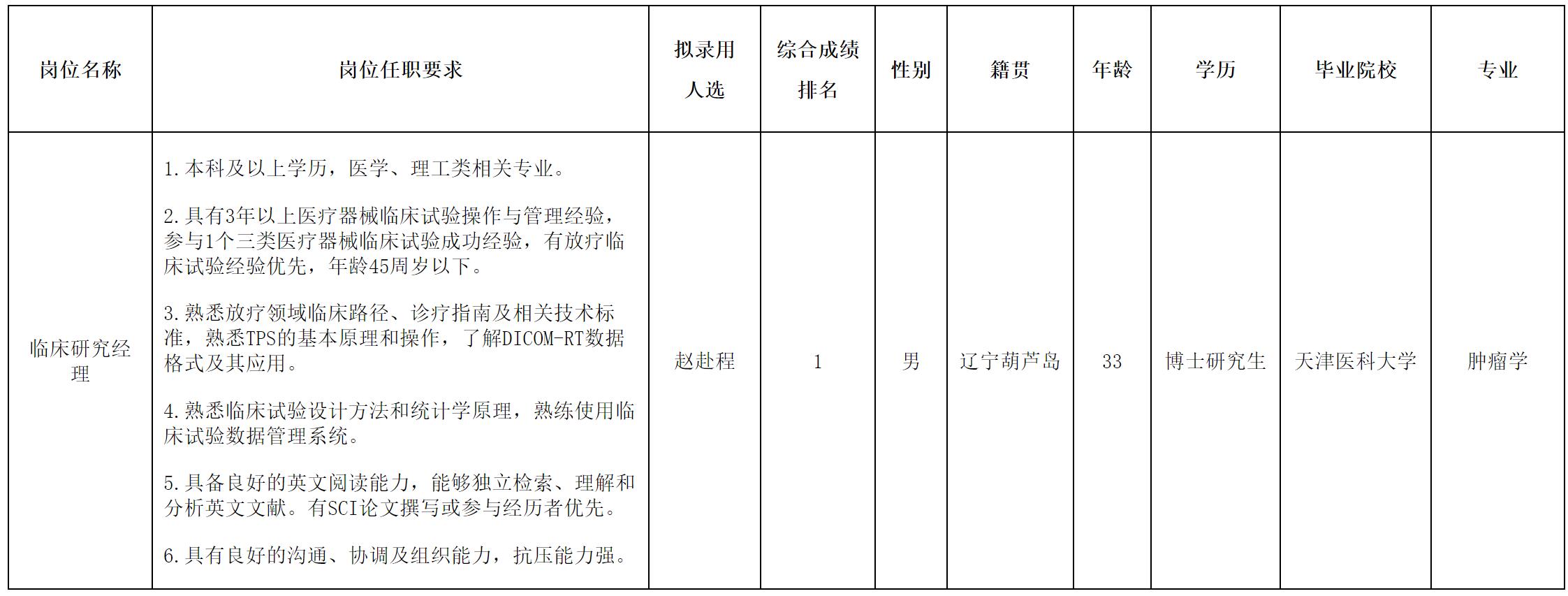 根據(jù)中玖閃光醫(yī)療科技有限公司發(fā)布的招聘公告及招聘相關(guān)規(guī)定,經(jīng)面試、考察、體檢等程序,擬錄用趙赴程同志到中玖閃光醫(yī)療科技有限公司工作,現(xiàn)予以公示,具體情況如下: