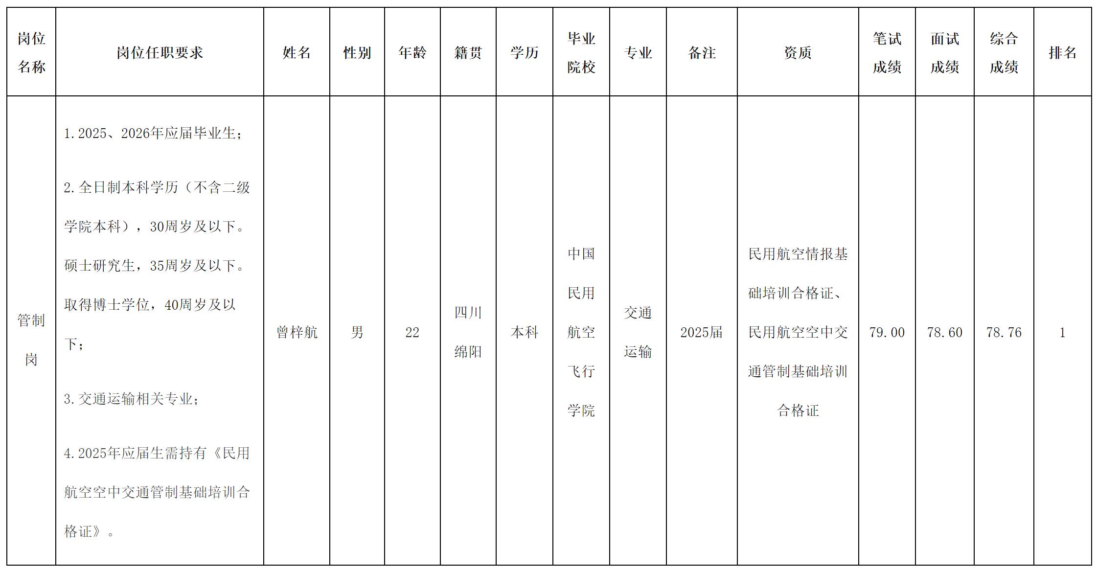 根據(jù)綿陽機(jī)場(集團(tuán))有限公司2025年10月發(fā)布的《關(guān)于2025年秋季招聘管制崗位的公告》以及招聘相關(guān)規(guī)定,經(jīng)筆試、面試、背景調(diào)查、體檢、心理測試等程序,擬錄用曾梓航為綿陽機(jī)場(集團(tuán))有限公司職工,現(xiàn)予以公示,具體情況如下: