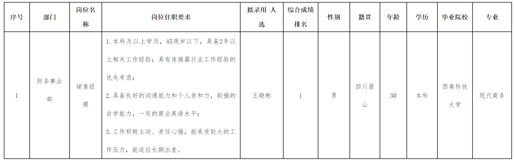 根據(jù)四川華豐科技股份有限公司發(fā)布的招聘公告及招聘相關(guān)規(guī)定,經(jīng)面試、考察、體檢等程序,擬錄用王曉彬同志到四川華豐科技股份有限公司工作,現(xiàn)予以公示,具體情況如下: