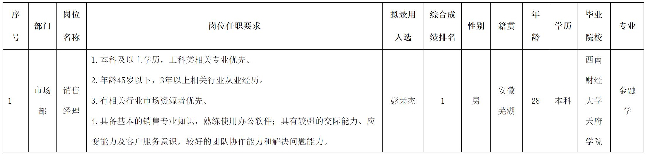 根據(jù)四川長虹電子科技有限公司發(fā)布的招聘公告及招聘相關(guān)規(guī)定,經(jīng)筆試、面試、考察、體檢等程序,擬錄用彭榮杰同志到公司市場部工作,現(xiàn)予以公示,具體情況如下:
