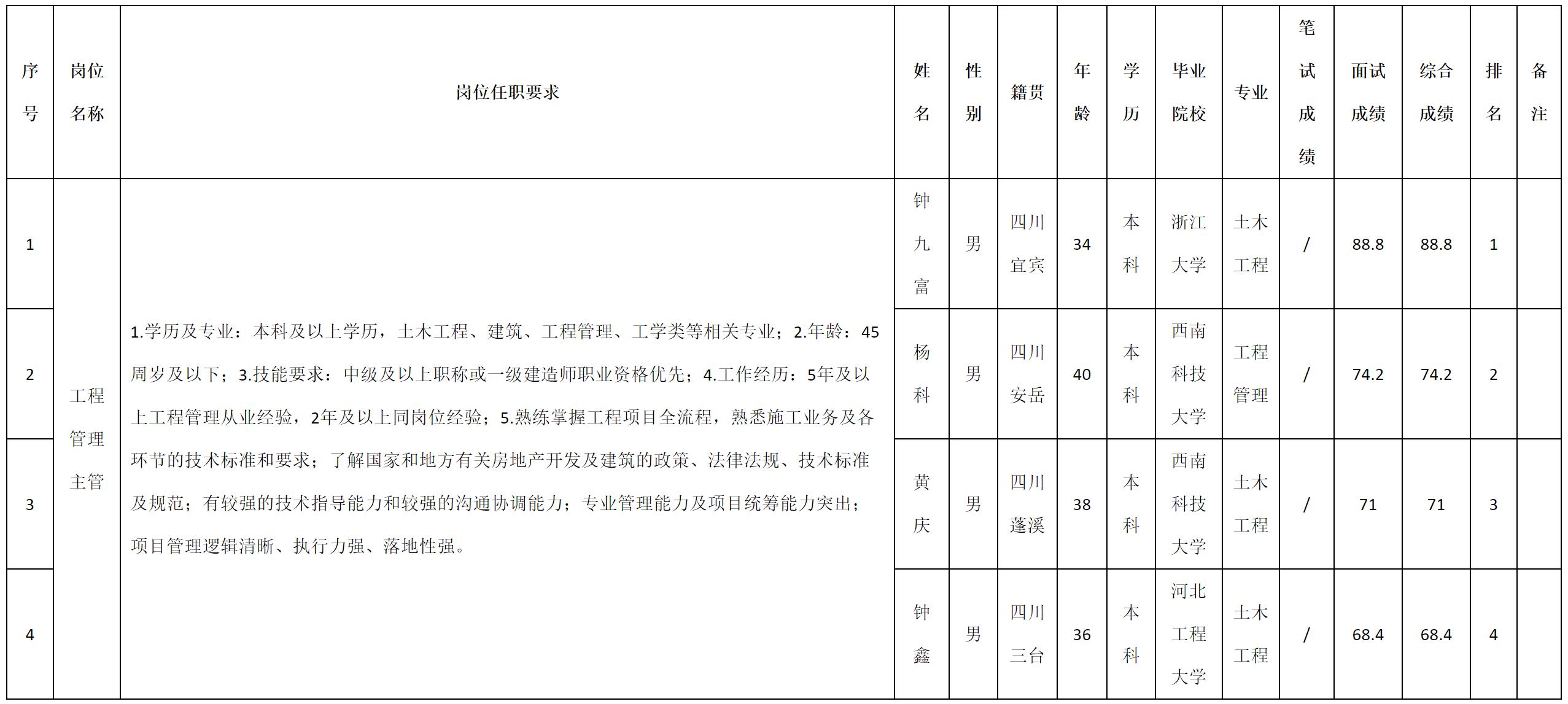 根據(jù)九洲千城置業(yè)有限責(zé)任公司發(fā)布的招聘公告及招聘相關(guān)規(guī)定,現(xiàn)將測試成績予以公示。