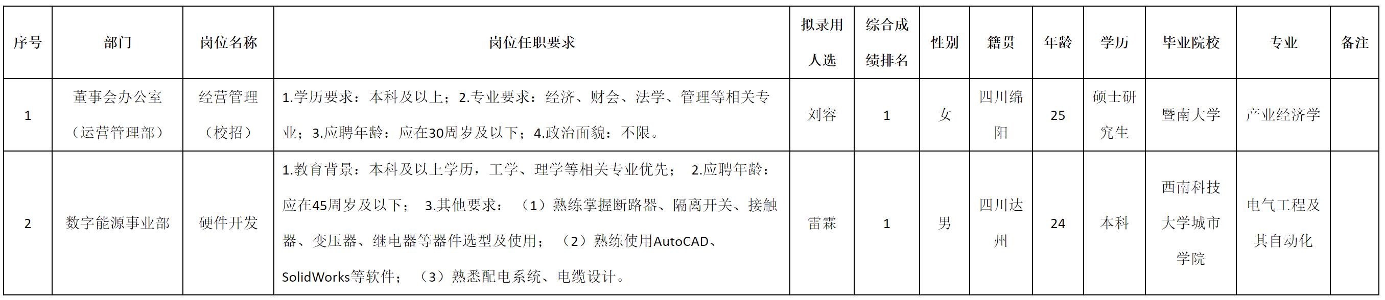 根據(jù)四川九州電子科技股份有限公司發(fā)布的招聘公告及招聘相關(guān)規(guī)定,經(jīng)測試、考察、體檢等程序,擬錄用劉容等2名同志到四川九州電子科技股份有限公司工作,現(xiàn)予以公示,具體情況如下: