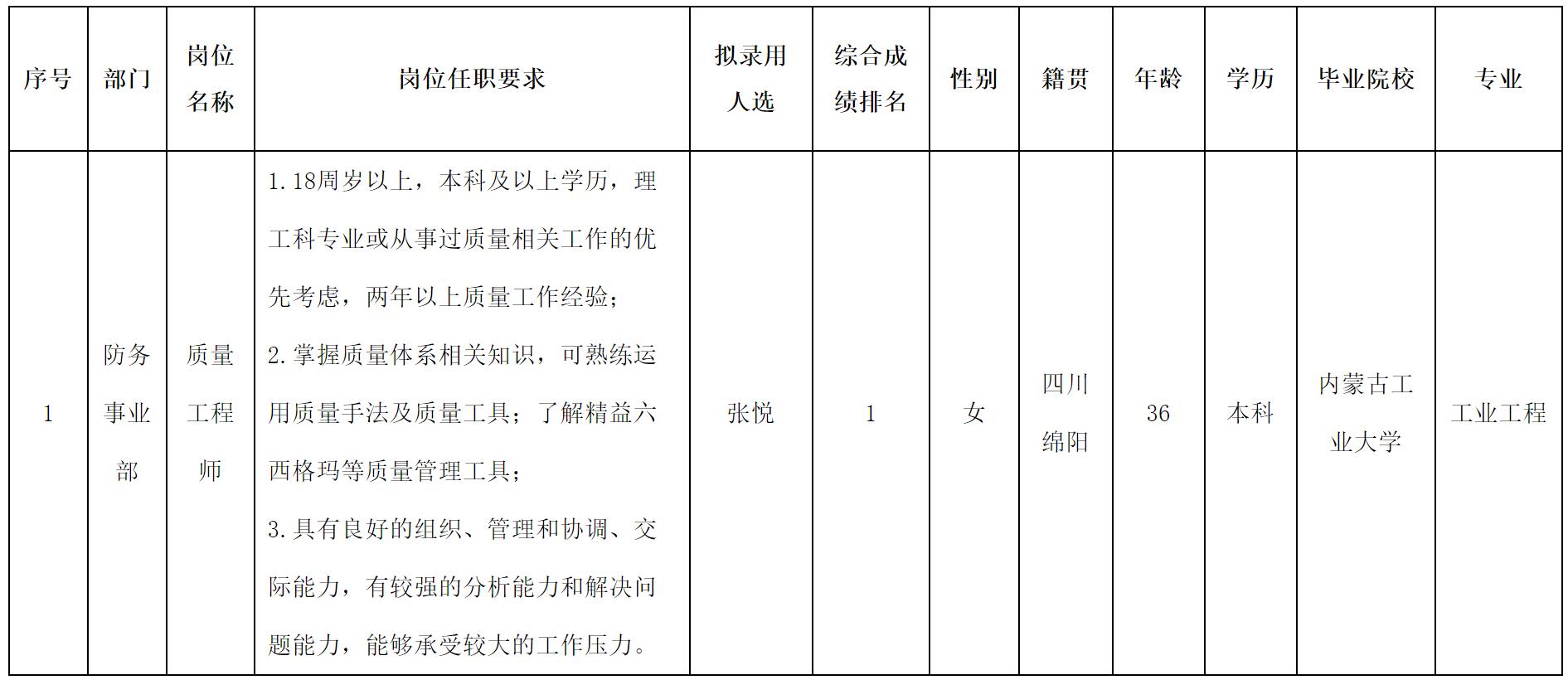 根據(jù)四川華豐科技股份有限公司發(fā)布的招聘公告及招聘相關(guān)規(guī)定,經(jīng)筆試、面試、考察、體檢等程序,擬錄用張悅同志到四川華豐科技股份有限公司工作,現(xiàn)予以公示,具體情況如下: