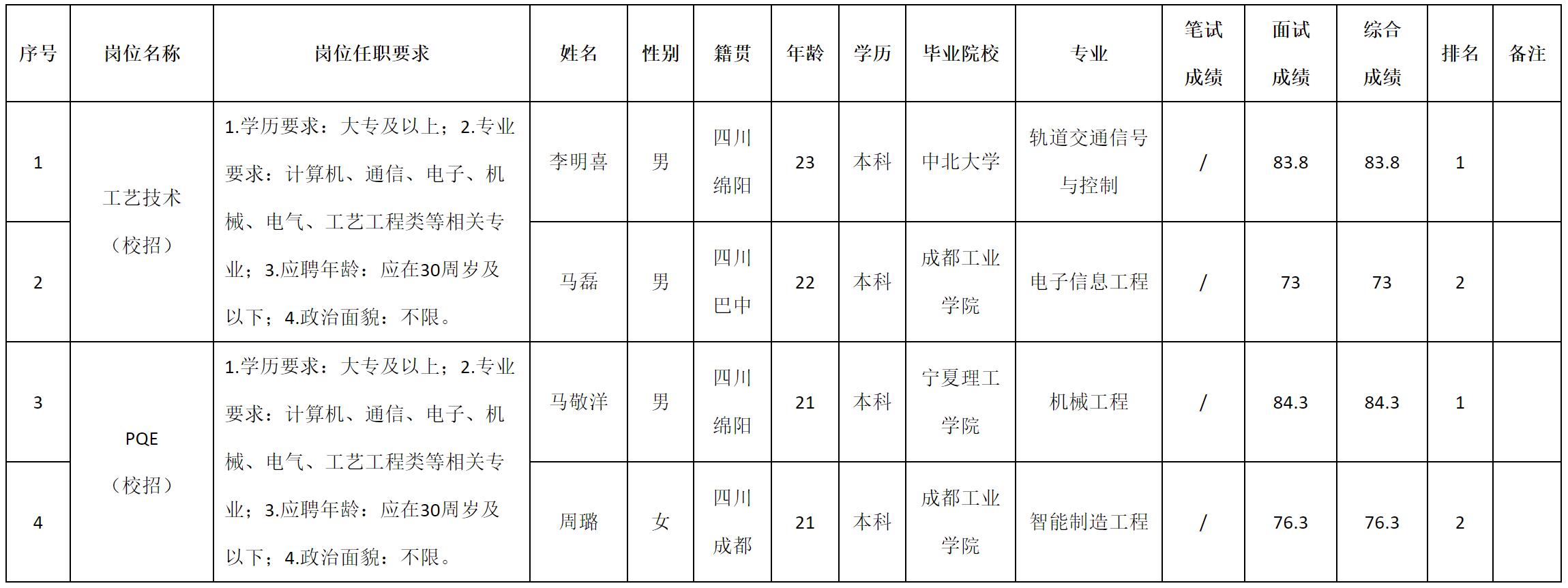 根據(jù)四川九州電子科技股份有限公司發(fā)布的招聘公告及招聘相關(guān)規(guī)定,現(xiàn)將測(cè)試成績(jī)予以公示。