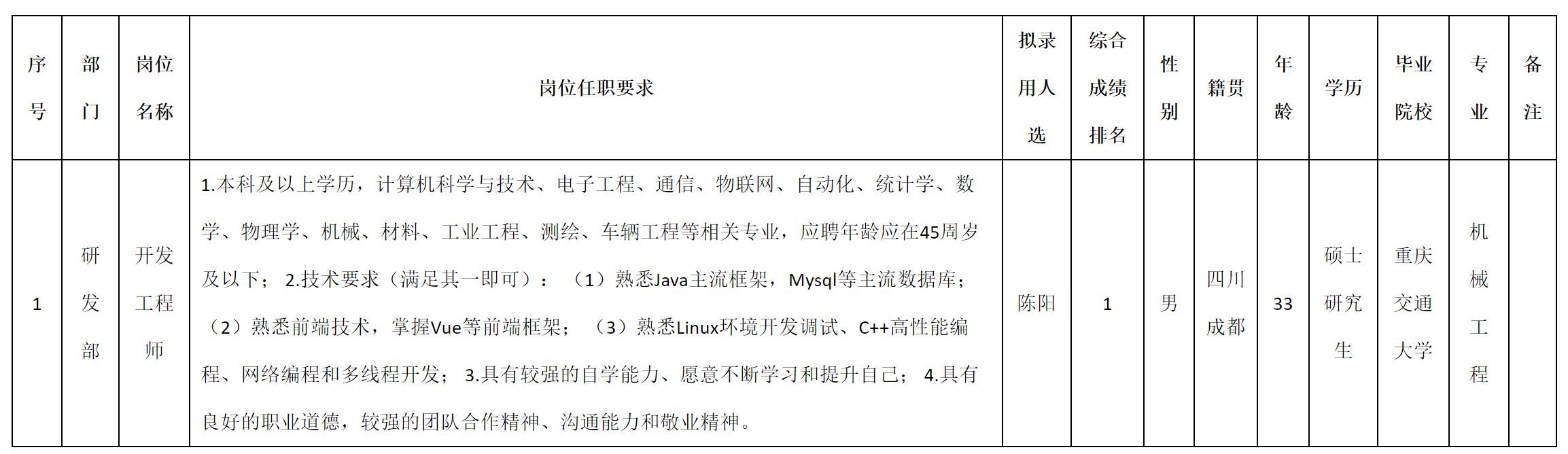 根據(jù)四川九洲投資控股集團有限公司軟件與數(shù)據(jù)智能軍團發(fā)布的招聘公告及招聘相關(guān)規(guī)定,經(jīng)測試、考察、體檢等程序,擬錄用陳陽同志到四川九洲投資控股集團有限公司軟件與數(shù)據(jù)智能軍團工作,現(xiàn)予以公示,具體情況如下: