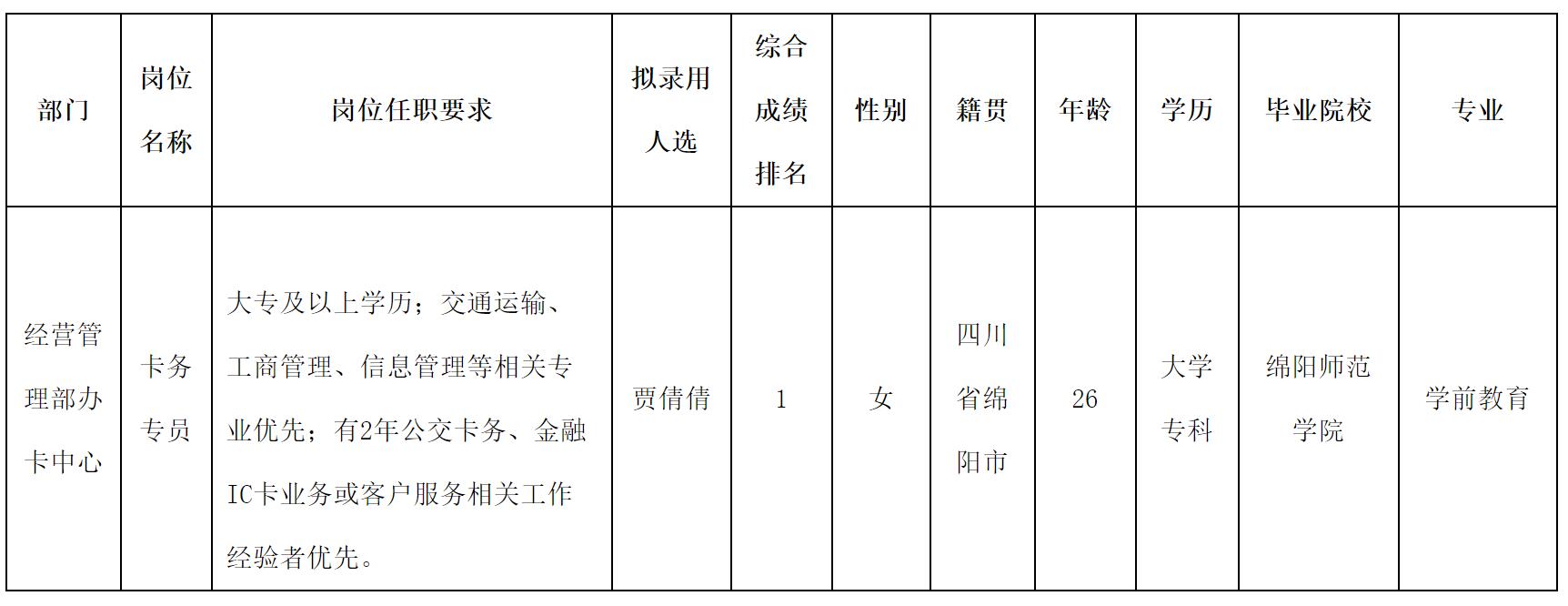 根據(jù)綿陽市綿州通科技有限責任公司發(fā)布的招聘公告及招聘相關規(guī)定,經(jīng)筆試、面試、體檢等程序,擬錄用賈倩倩到綿陽市綿州通科技有限責任公司工作,現(xiàn)予以公示,具體情況如下:
