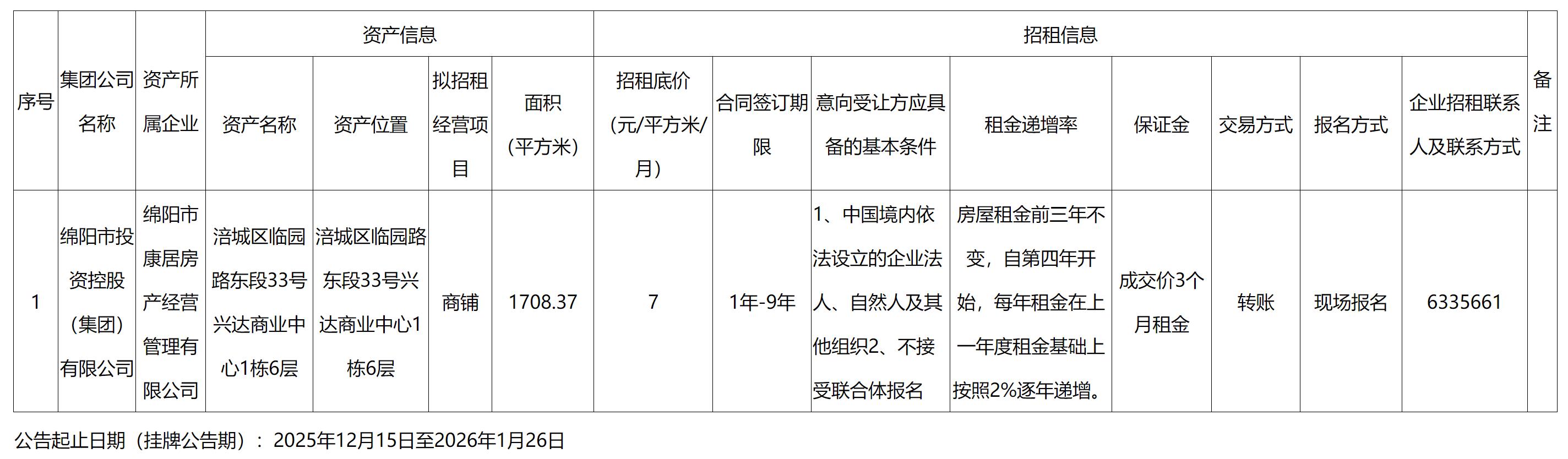 綿陽市康居房產(chǎn)經(jīng)營管理有限公司資產(chǎn)出租公告