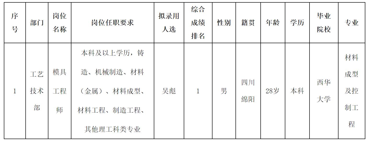 根據(jù)四川波鴻實業(yè)有限公司發(fā)布的招聘公告及招聘相關(guān)規(guī)定,經(jīng)面試、體檢等程序,擬錄用吳彪同志到四川威斯卡特工業(yè)有限公司綿陽分公司工作,現(xiàn)予以公示,具體情況如下: