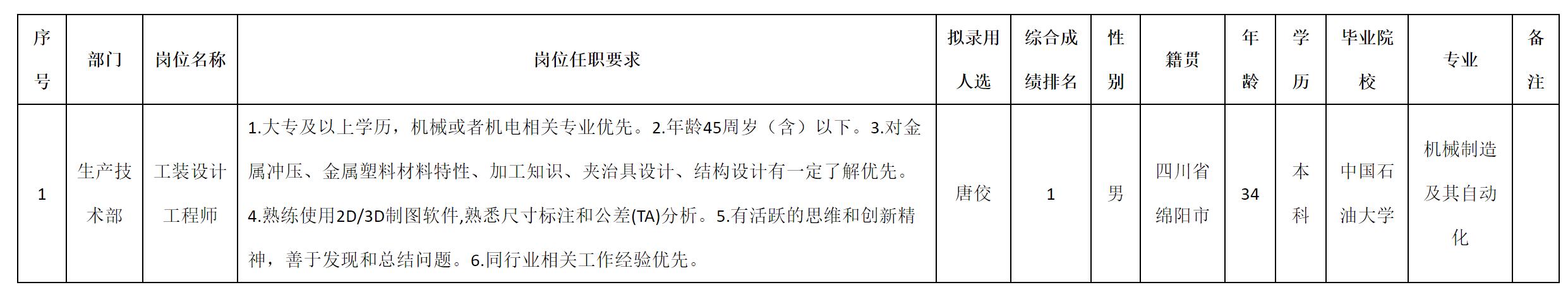 根據(jù)四川安和精密電子電器股份有限公司發(fā)布的招聘公告及招聘相關(guān)規(guī)定,經(jīng)測試、考察、體檢等程序,擬錄用唐佼同志到四川安和精密電子電器股份有限公司工作,現(xiàn)予以公示,具體情況如下: