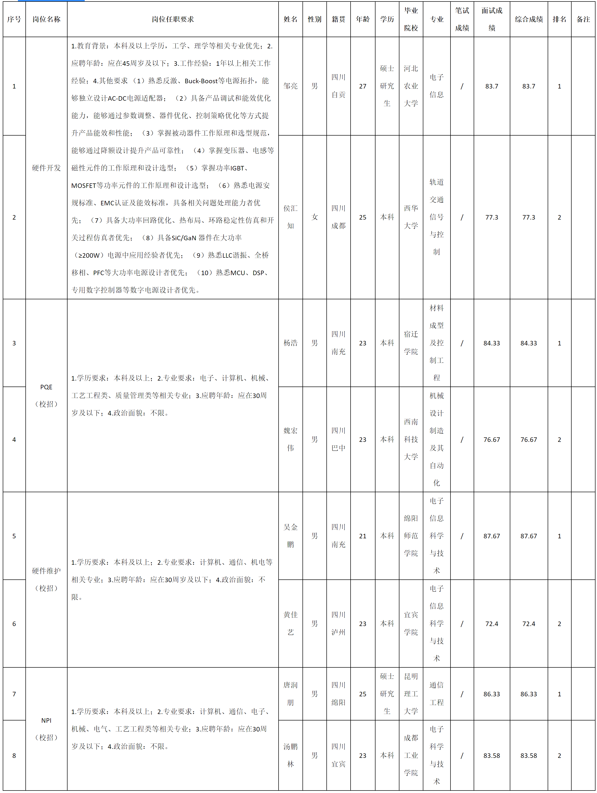 根據(jù)四川九州電子科技股份有限公司發(fā)布的招聘公告及招聘相關(guān)規(guī)定,現(xiàn)將測(cè)試成績(jī)予以公示。