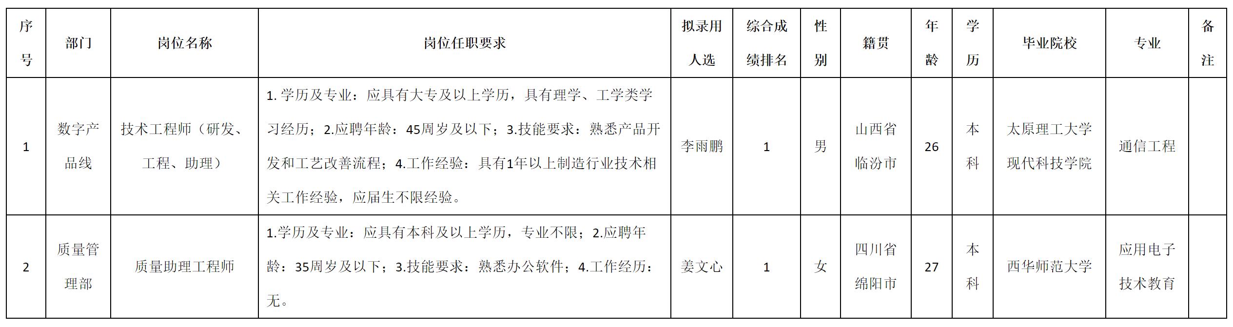 根據(jù)四川九州光電子技術(shù)有限公司發(fā)布的招聘公告及招聘相關(guān)規(guī)定,經(jīng)測(cè)試、考察、體檢等程序,擬錄用李雨鵬等2名同志到四川九州光電子技術(shù)有限公司工作,現(xiàn)予以公示,具體情況如下: