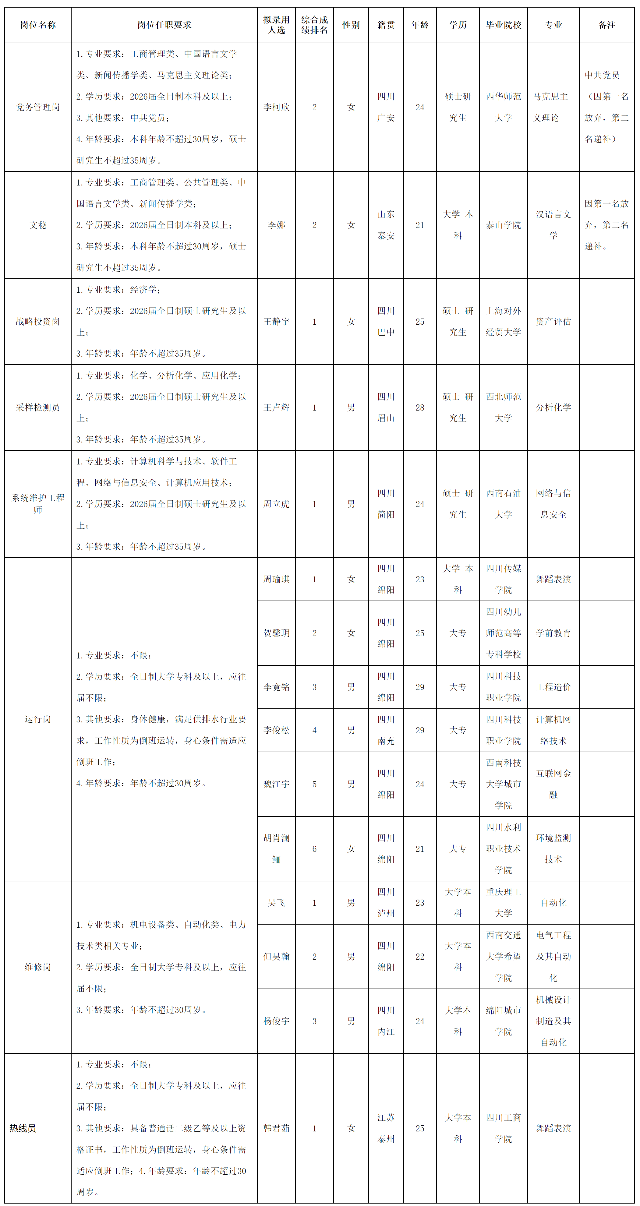 根據(jù)綿陽(yáng)市水務(wù)(集團(tuán))有限公司發(fā)布的招聘公告及招聘相關(guān)規(guī)定,經(jīng)筆試、面試、考察、體檢等程序,擬錄用李柯欣、李娜等同志到綿陽(yáng)市水務(wù)(集團(tuán))有限公司工作,現(xiàn)予以公示,具體情況如下: