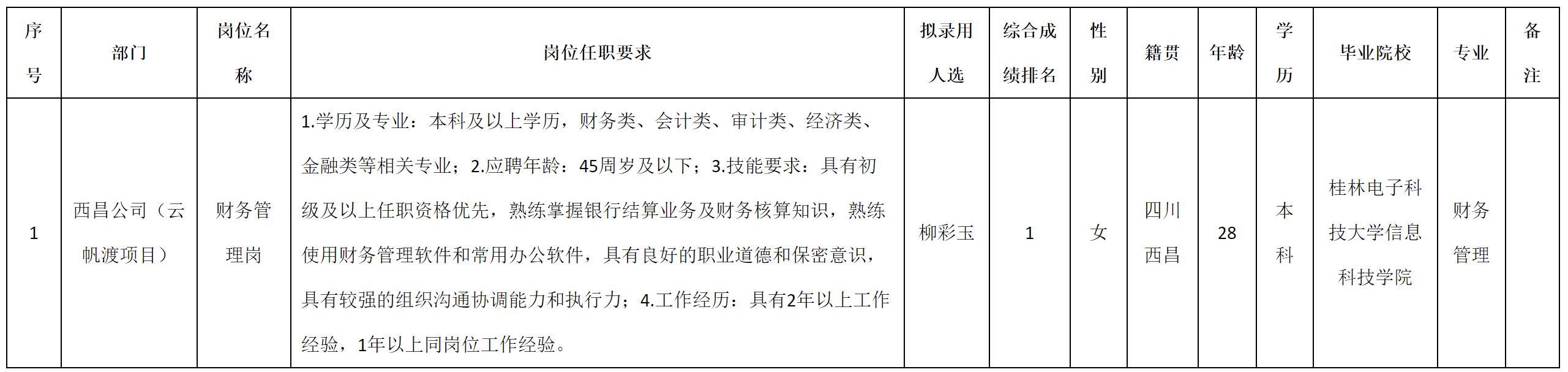 根據(jù)西昌千城置業(yè)有限公司發(fā)布的招聘公告及招聘相關(guān)規(guī)定,經(jīng)測試、考察、體檢等程序,擬錄用柳彩玉同志到西昌千城置業(yè)有限公司工作,現(xiàn)予以公示,具體情況如下: