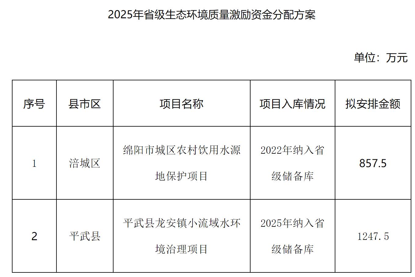 四川省財(cái)政廳、四川省生態(tài)環(huán)境廳以川財(cái)資環(huán)〔2025〕65號號下達(dá)我市2025年省級生態(tài)環(huán)境質(zhì)量激勵資金2105萬元。根據(jù)“資金跟著項(xiàng)目走”的要求,我局選取央省儲備庫符合資金分配條件的項(xiàng)目,會同綿陽市財(cái)政局?jǐn)M定了資金分配方案,現(xiàn)予以公示。
