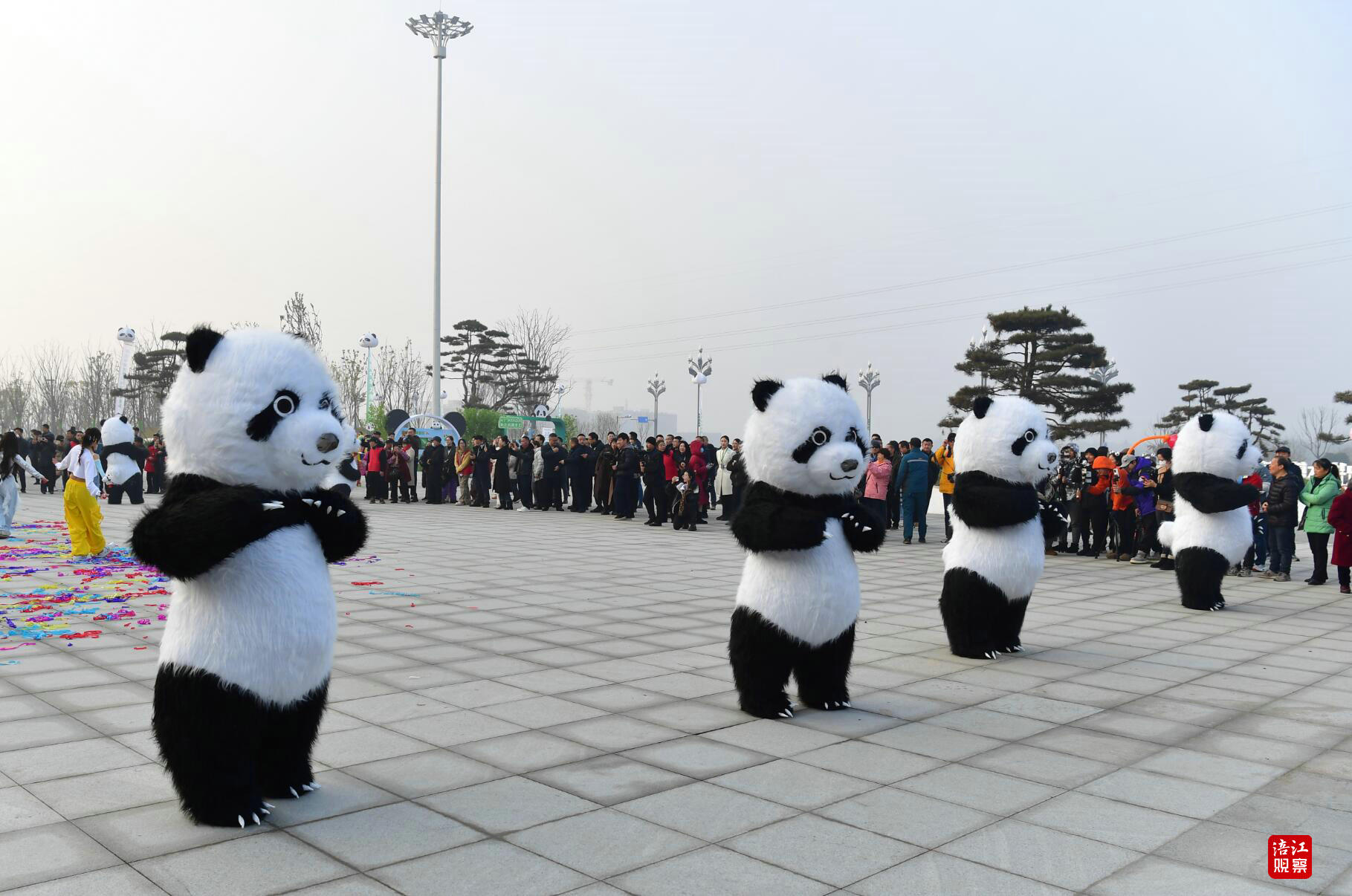 “奇妙巡游”中,可愛的充氣熊貓人偶與游客親切互動(dòng),合影留念;