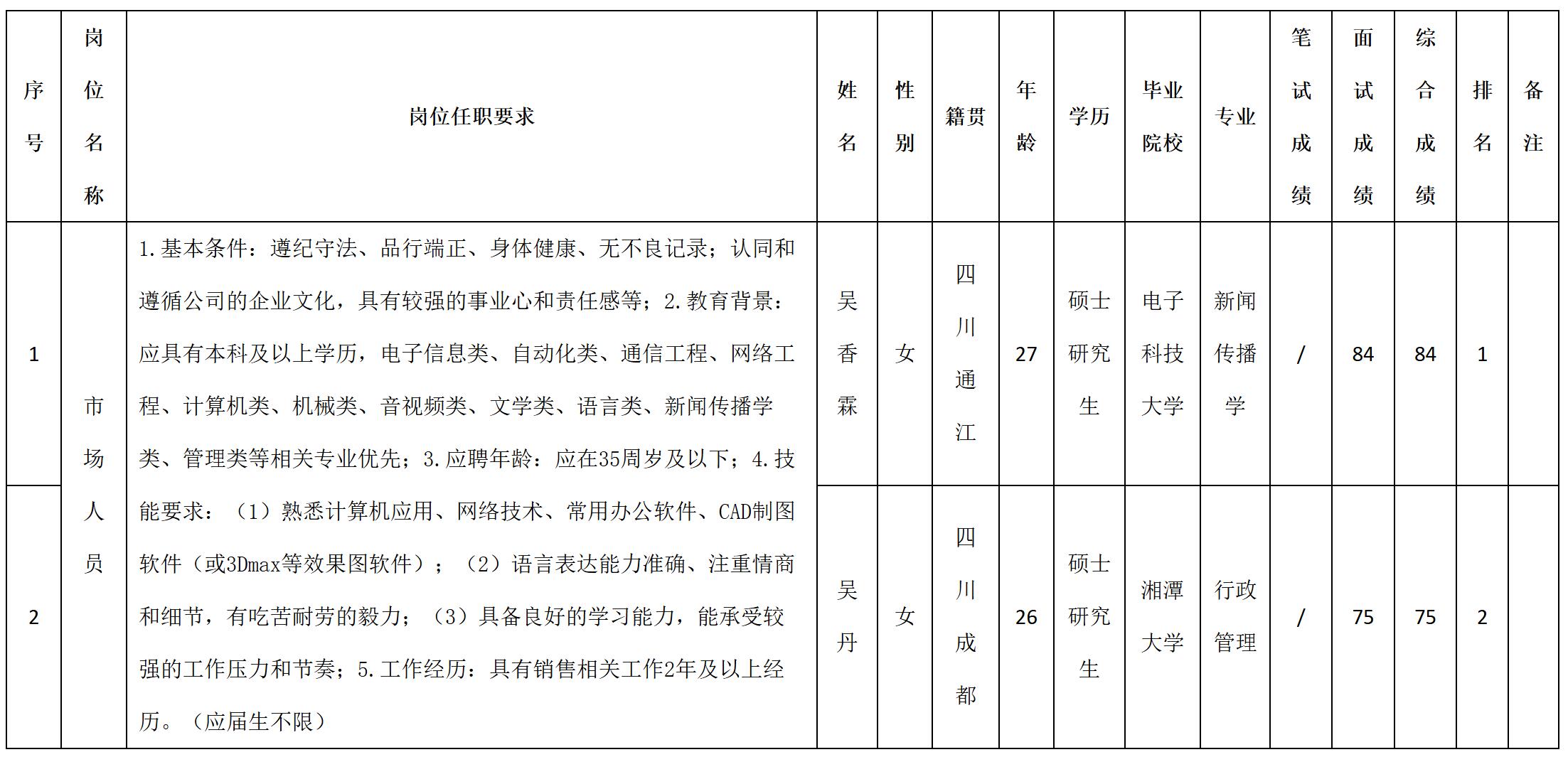 根據(jù)四川湖山電器股份有限公司發(fā)布的招聘公告及招聘相關(guān)規(guī)定,經(jīng)筆試、面試等程序,現(xiàn)將筆試(面試)成績予以公示。
