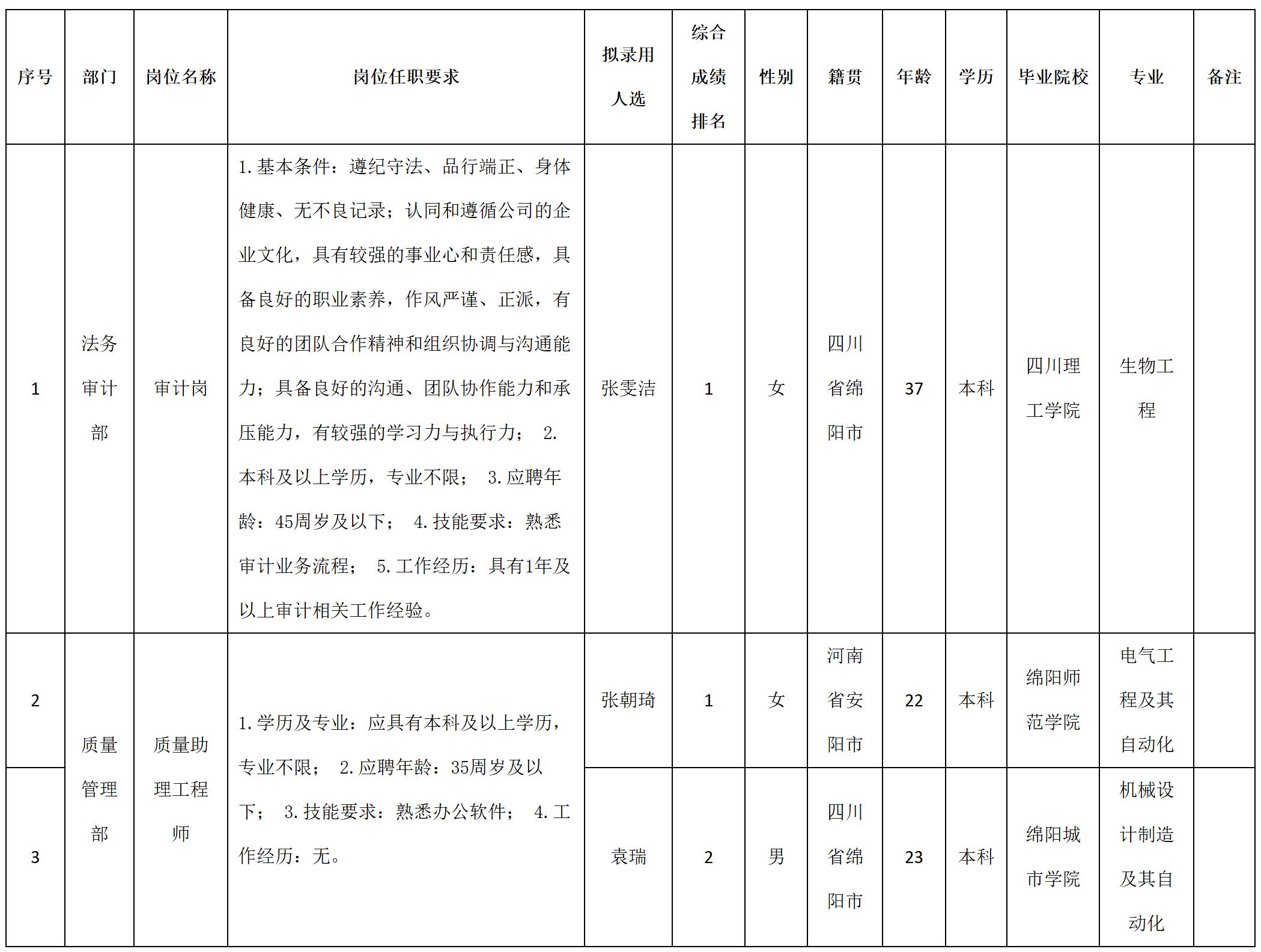 根據(jù)四川九州光電子技術(shù)有限公司發(fā)布的招聘公告及招聘相關(guān)規(guī)定,經(jīng)筆試、面試、考察、體檢等程序,擬錄用張?chǎng)嵉?名同志到四川九州光電子技術(shù)有限公司工作,現(xiàn)予以公示,具體情況如下: