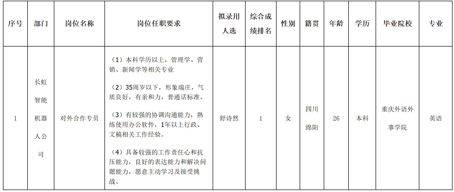 根據(jù)四川長虹虹微科技有限公司發(fā)布的招聘公告及招聘相關規(guī)定,經面試,擬錄用舒詩然同志到公司工作,現(xiàn)予以公示,具體情況如下: