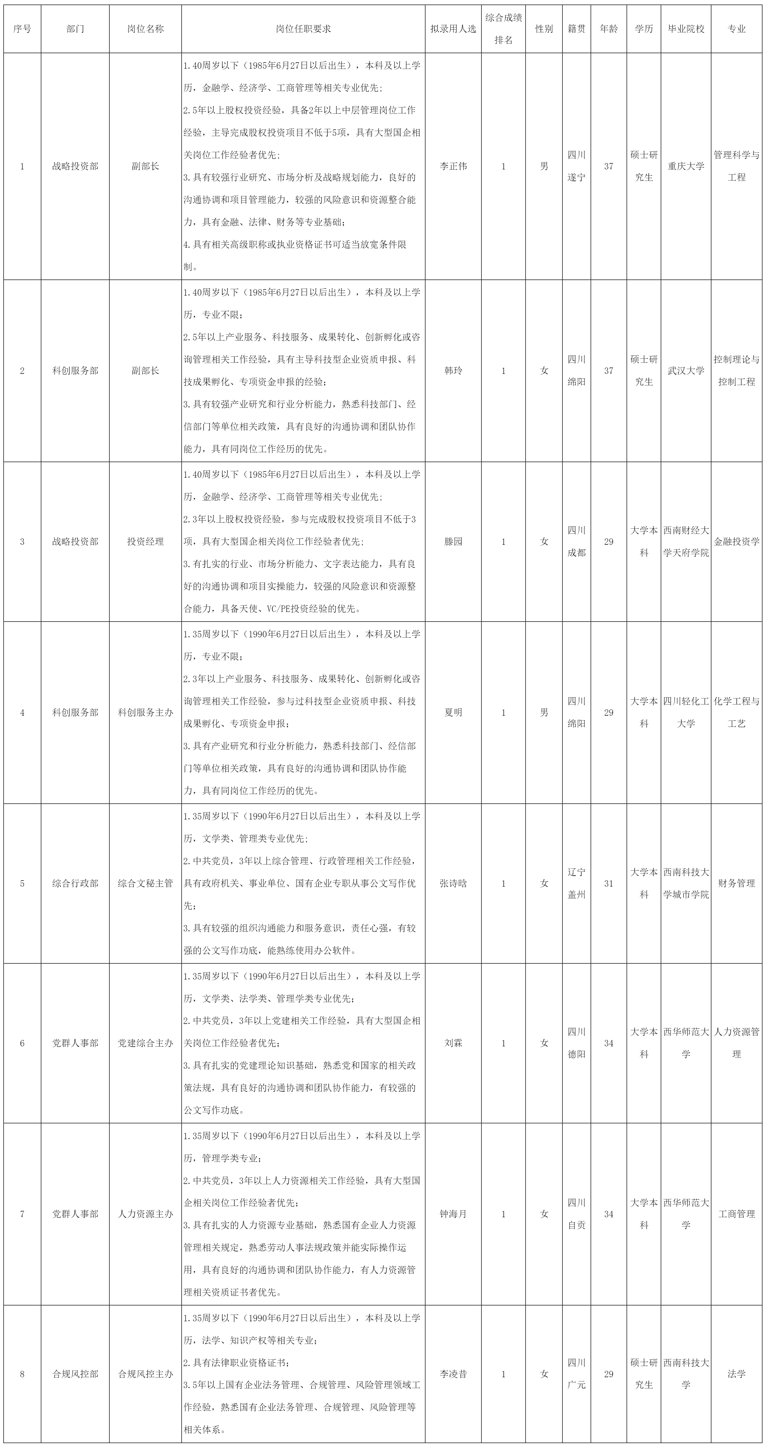 根據(jù)綿陽科技城科技創(chuàng)新投資有限公司發(fā)布的第一批中層管理人員及員工招聘公告及招聘相關(guān)規(guī)定,經(jīng)筆試、面試、考察、體檢等程序,擬錄用李正偉、韓玲等8位同志到綿陽科技城科技創(chuàng)新投資有限公司工作,現(xiàn)予以公示,具體情況如下: