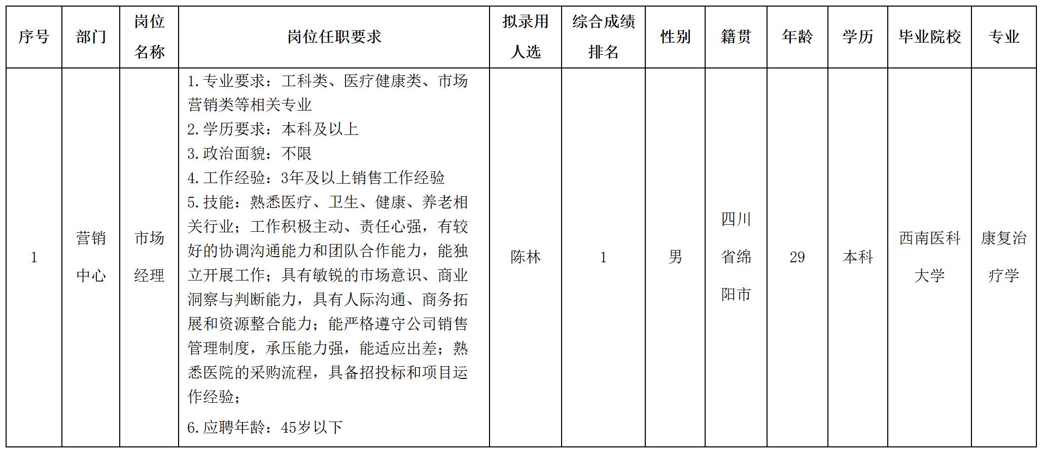 根據(jù)四川長虹智慧健康科技有限公司發(fā)布的招聘公告及招聘相關規(guī)定,經(jīng)面試,擬錄用陳林同志到營銷中心工作,現(xiàn)予以公示,具體情況如下: