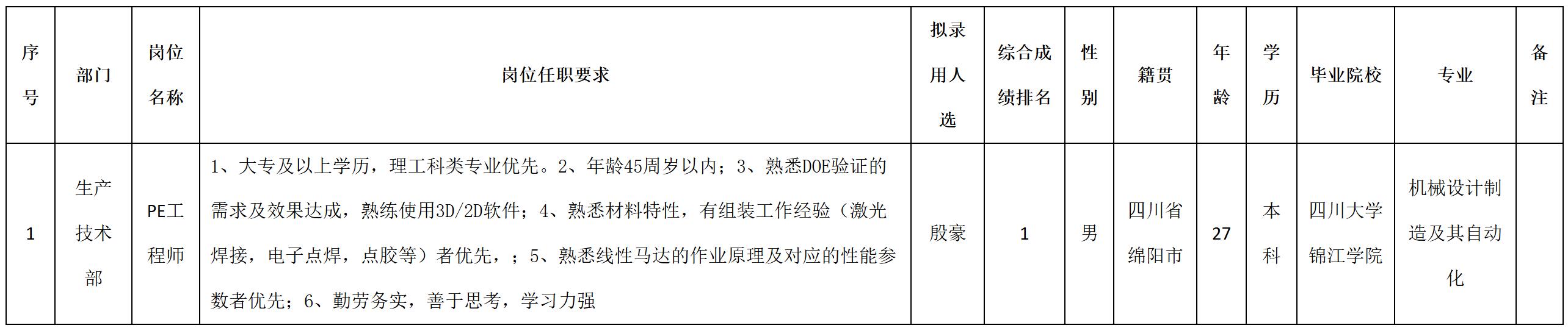 根據(jù)四川安和精密電子電器股份有限公司發(fā)布的招聘公告及招聘相關(guān)規(guī)定,經(jīng)筆試、面試、考察、體檢等程序,擬錄用殷豪同志到四川安和精密電子電器股份有限公司工作,現(xiàn)予以公示,具體情況如下: