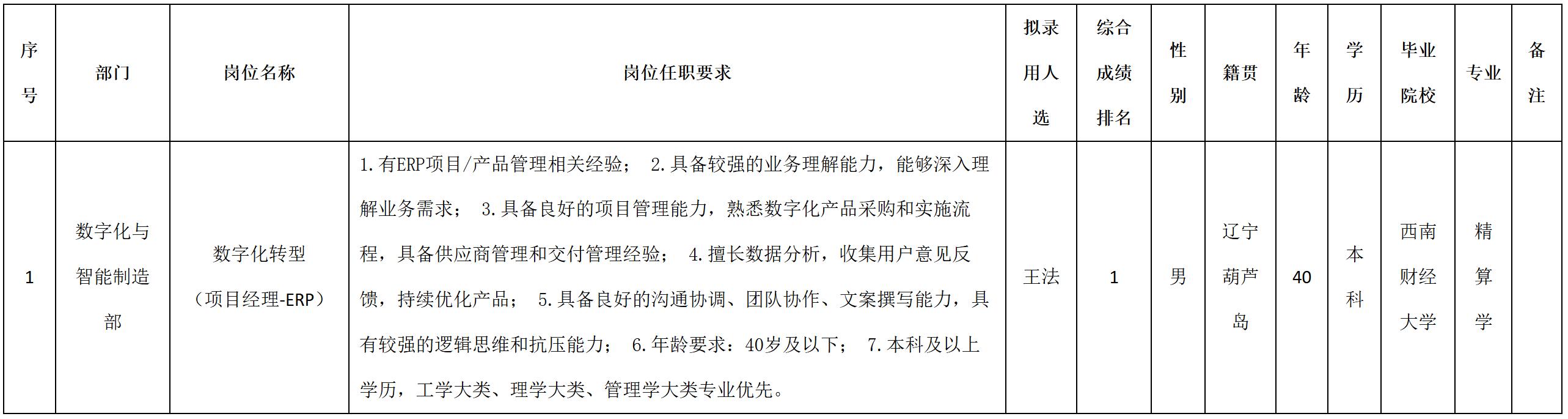 根據(jù)四川九洲投資控股集團有限公司發(fā)布的招聘公告及招聘相關規(guī)定,經(jīng)筆試、面試、考察、體檢等程序,擬錄用王法同志到四川九洲投資控股集團有限公司工作,現(xiàn)予以公示,具體情況如下: