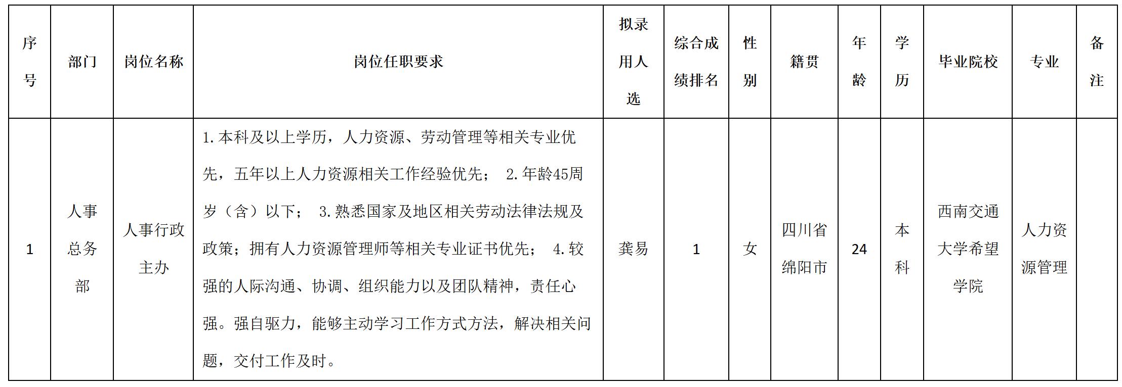 根據四川安和精密電子電器股份有限公司發(fā)布的招聘公告及招聘相關規(guī)定,經筆試、面試、考察、體檢等程序,擬錄用龔易同志到四川安和精密電子電器股份有限公司工作,現予以公示,具體情況如下: