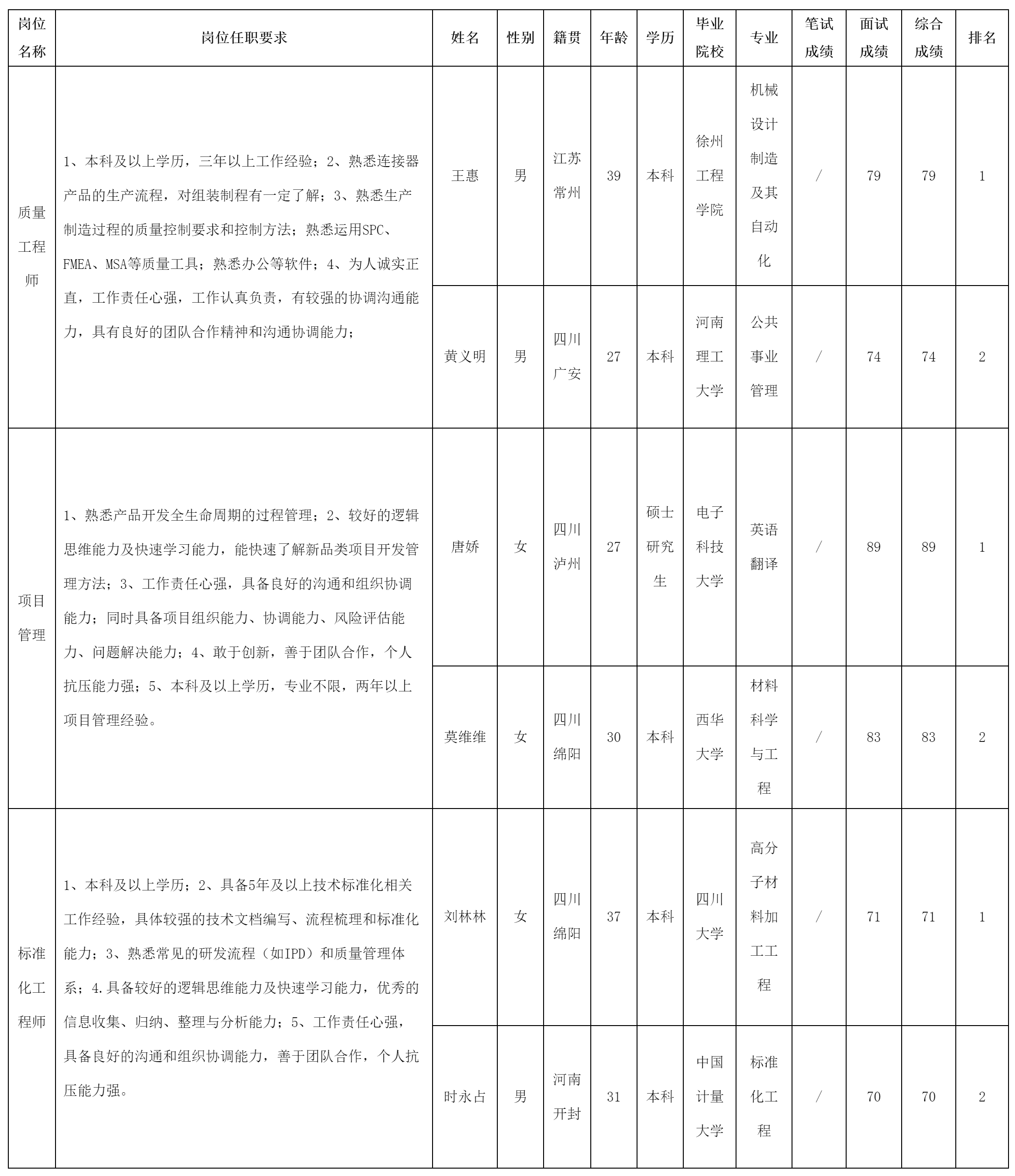 根據(jù)四川華豐科技股份有限公司發(fā)布的招聘公告及招聘相關(guān)規(guī)定,經(jīng)筆試、面試等程序,現(xiàn)將筆試(面試)成績(jī)予以公示。