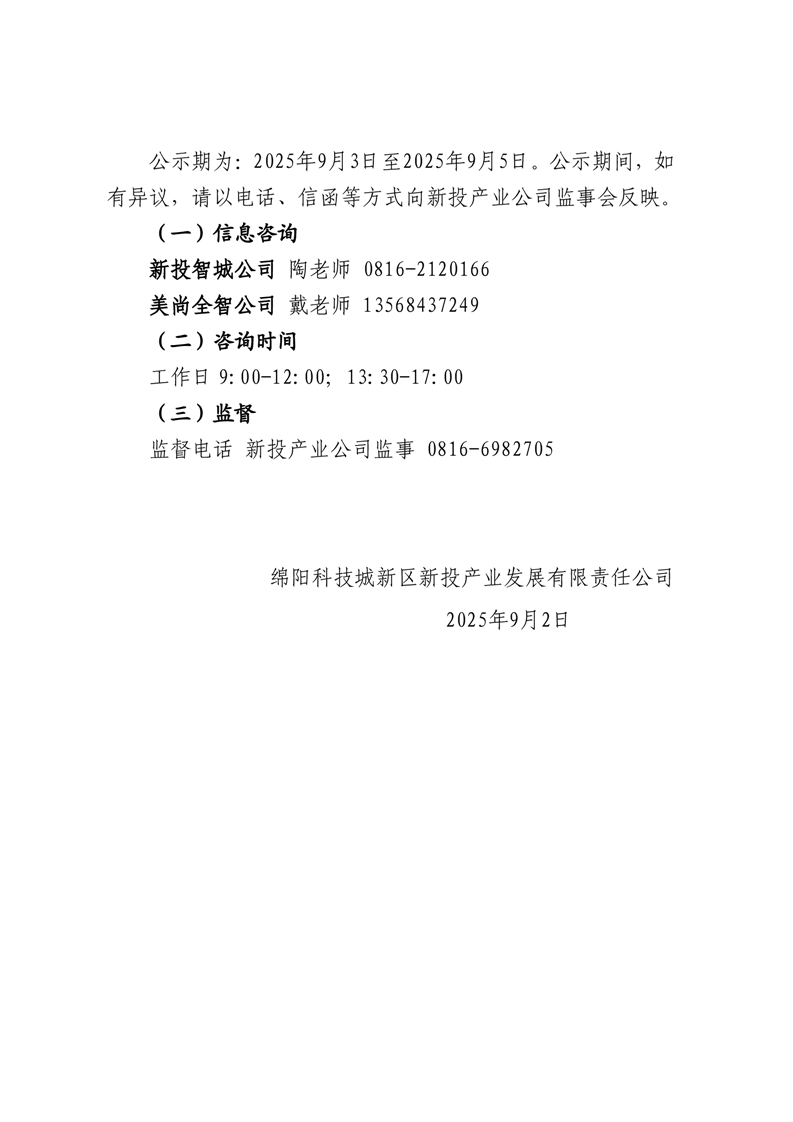 綿陽科技城新區(qū)新投產業(yè)發(fā)展有限責任公司所屬子公司人力資源需求招聘擬錄用人員公示(2025年第一批次)