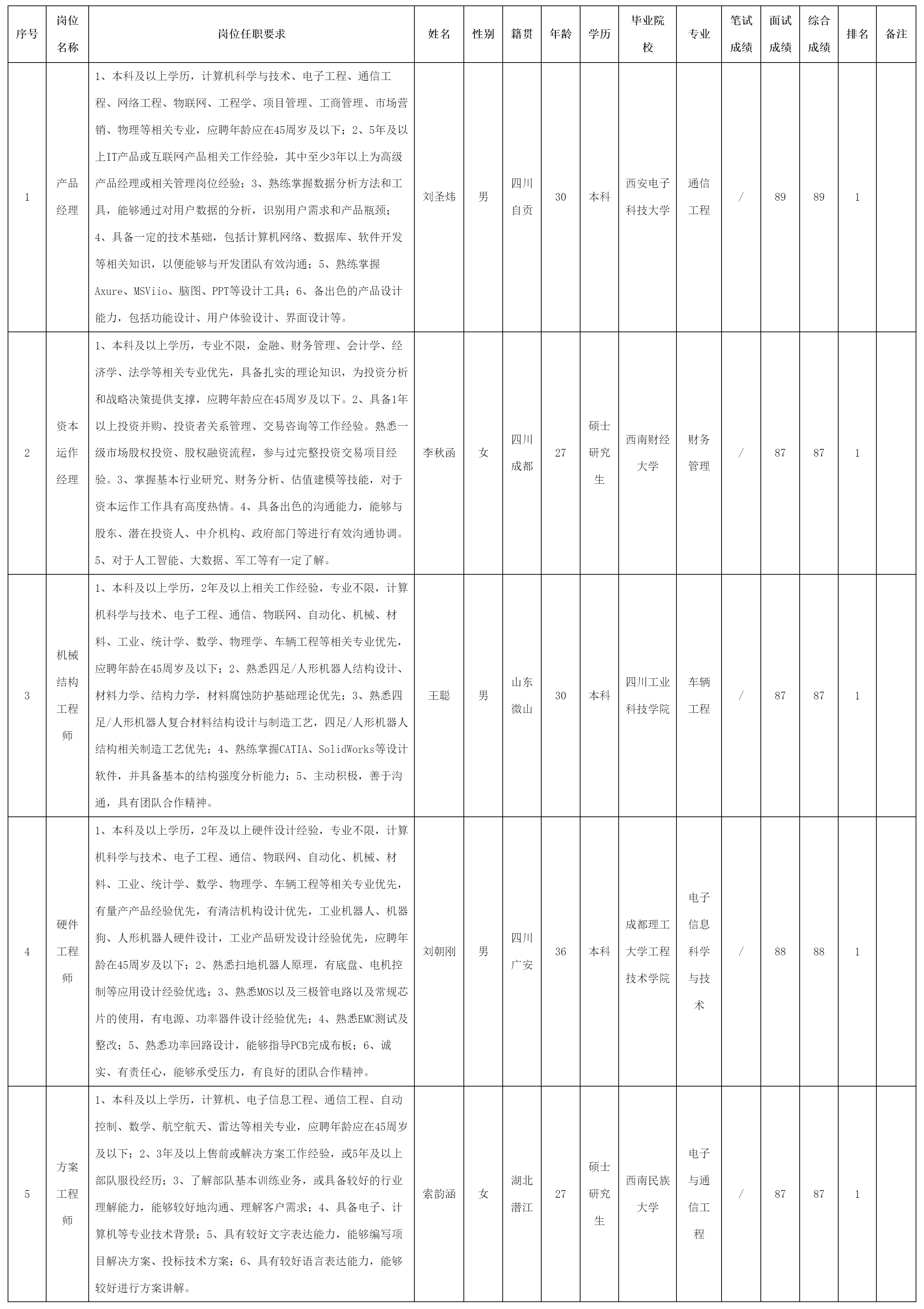 根據(jù)四川九洲投資控股集團(tuán)有限公司軟件與數(shù)據(jù)智能軍團(tuán)發(fā)布的招聘公告及招聘相關(guān)規(guī)定,經(jīng)筆試、面試等程序,現(xiàn)將筆試(面試)成績予以公示。