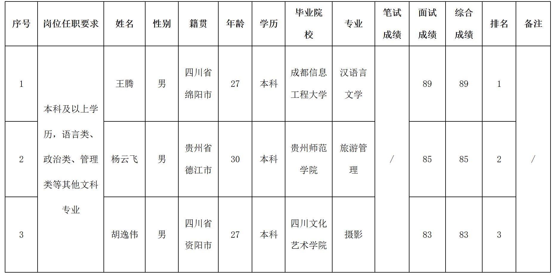 根據(jù)四川波鴻實(shí)業(yè)有限公司發(fā)布的招聘公告及招聘相關(guān)規(guī)定,經(jīng)面試等程序,現(xiàn)將面試成績予以公示。