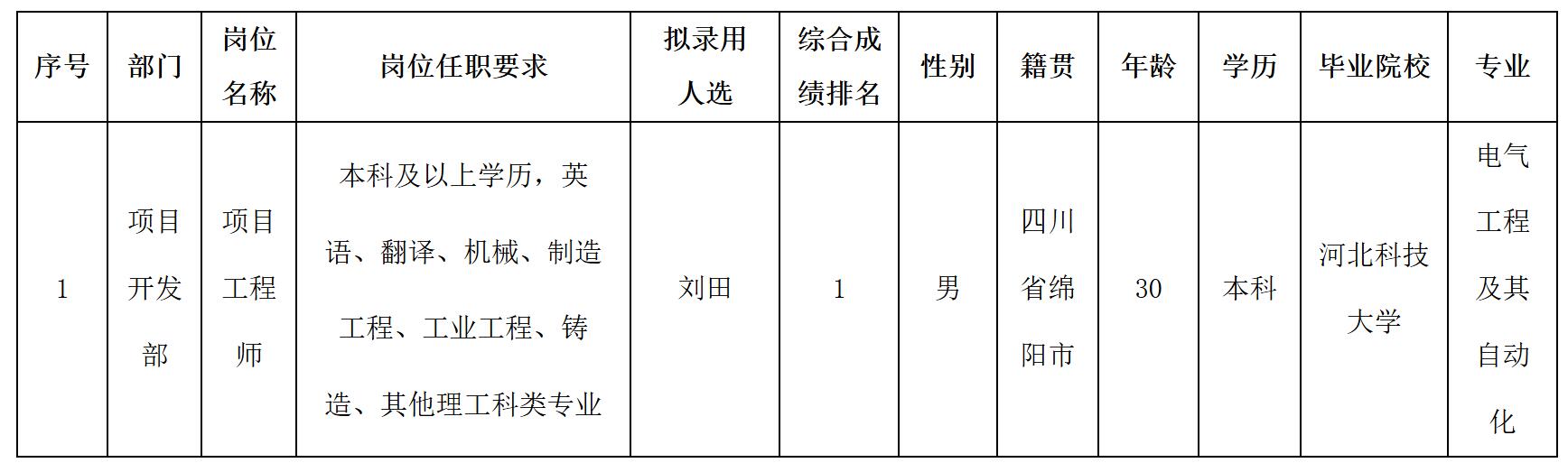 根據(jù)四川波鴻實業(yè)有限公司發(fā)布的招聘公告及招聘相關(guān)規(guī)定,經(jīng)面試、體檢等程序,擬錄用劉田同志到四川威斯卡特工業(yè)有限公司綿陽分公司工作,現(xiàn)予以公示,具體情況如下: