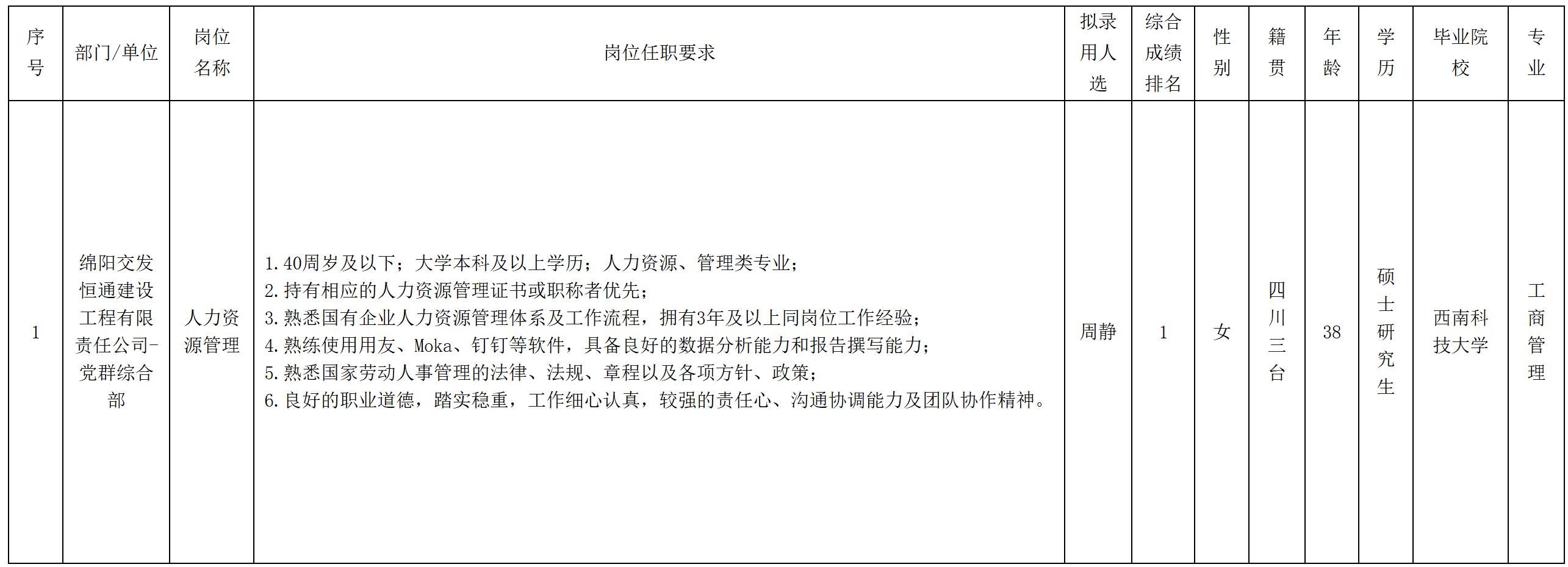 根據(jù)我司發(fā)布的招聘公告及招聘相關(guān)規(guī)定,經(jīng)初試、復試、體檢、背景調(diào)查等程序,擬錄用周靜同志到綿陽交發(fā)恒通建設(shè)工程有限責任公司工作,現(xiàn)予以公示,具體情況如下: