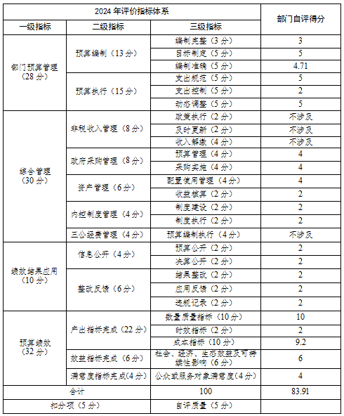 按照2024年度市本級部門整體支出績效評價體系及計分標(biāo)準(zhǔn),我單位較好的完成了本年度目標(biāo)任務(wù),整體績效評價結(jié)果為 “優(yōu)秀”。根據(jù)本部門收支情況、預(yù)算執(zhí)行情況、部門履職效益分析及整體績效管理情況綜合自評,剔除本部門不涉及指標(biāo),折算前得分為83.91分,折算后實(shí)際得分為95.35,自評等次為:優(yōu)秀。