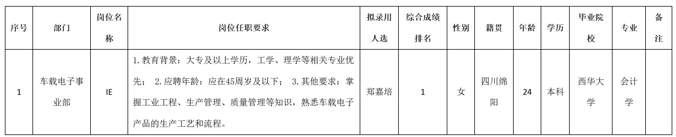 根據(jù)四川九州電子科技股份有限公司發(fā)布的招聘公告及招聘相關規(guī)定,經(jīng)筆試、面試、考察、體檢等程序,擬錄用鄭嘉培同志到四川九州電子科技股份有限公司工作,現(xiàn)予以公示,具體情況如下: