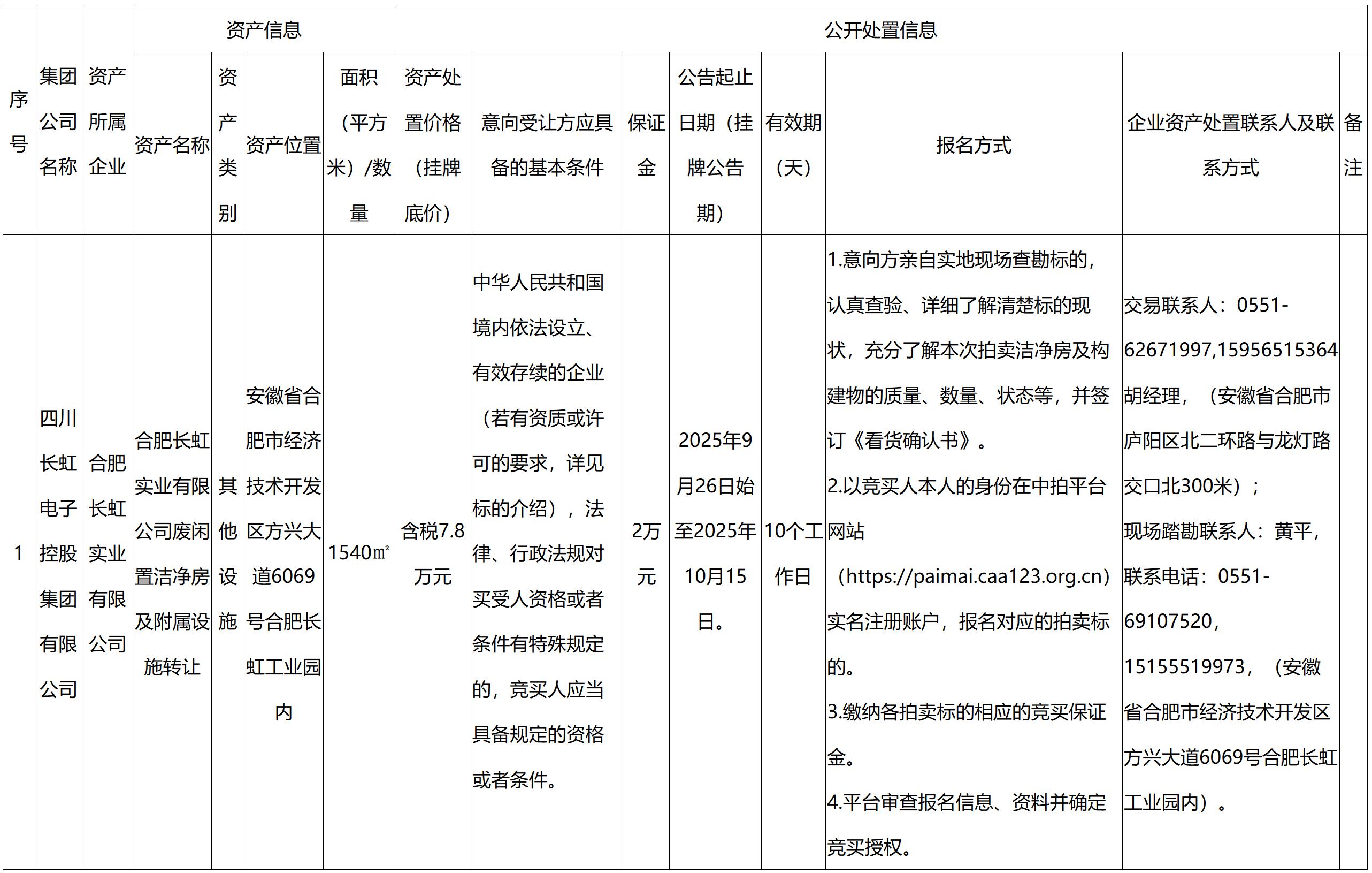 合肥長虹實(shí)業(yè)有限公司閑置資產(chǎn)處置公告