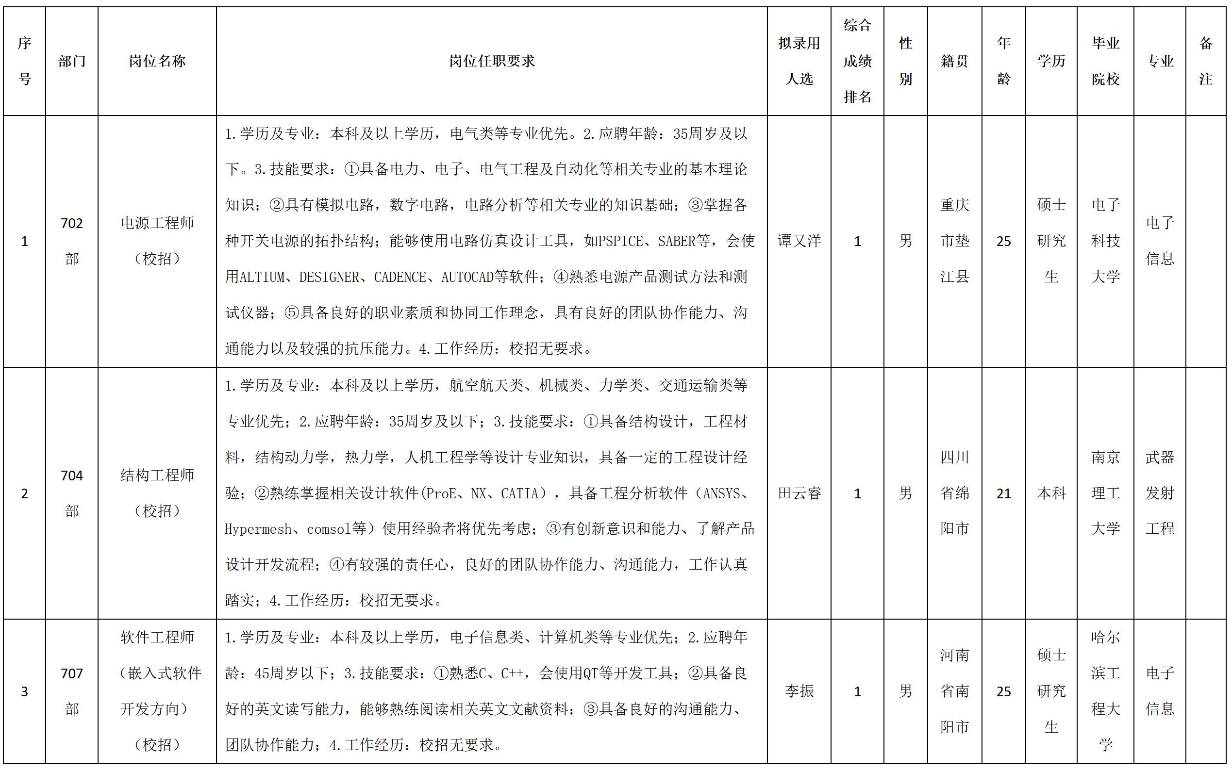 根據(jù)四川九洲電器集團有限責任公司發(fā)布的招聘公告及招聘相關規(guī)定,經(jīng)測試、考察、體檢等程序,擬錄用譚又洋等3名同志到四川九洲電器集團有限責任公司工作,現(xiàn)予以公示,具體情況如下: